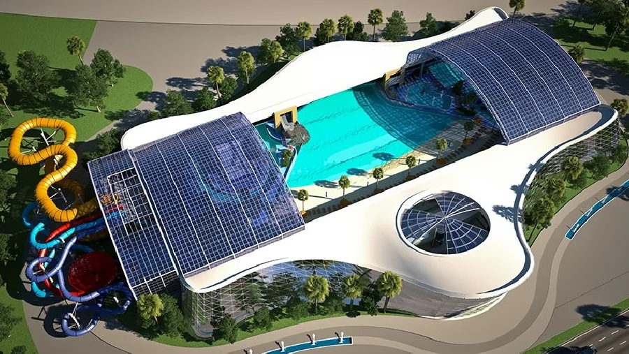 По своей характеристике, здание аквапарка предусматривается как монолитное железобетонное строение с алюминиевой открывающейся конструкцией крыши. Высотная отметка здания – 18 м. Летняя открытая часть предназначена для работы в теплый летний период и предназначена для увеличения вместимости и пропускной способности объекта.