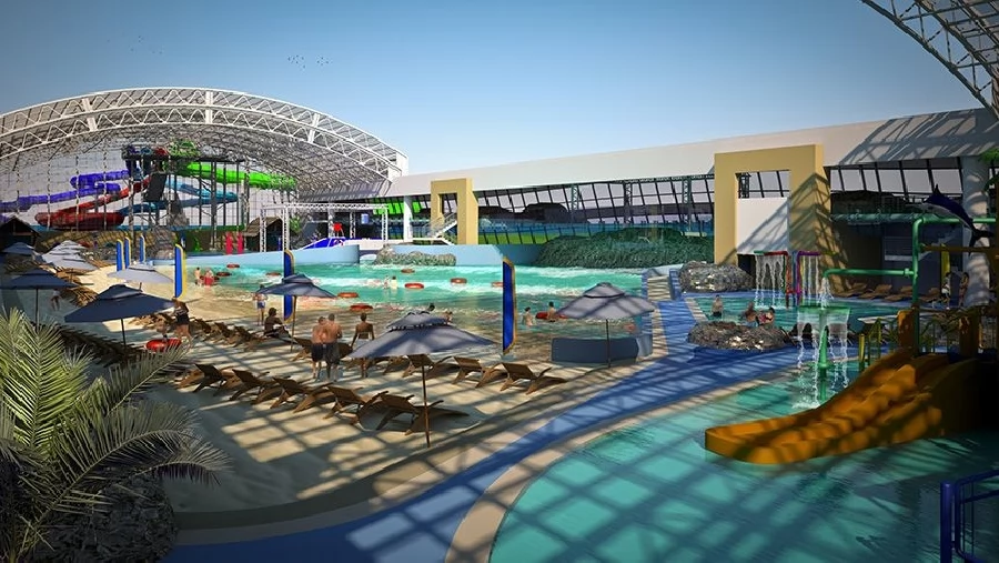 Водно-развлекательная зона является основой всего аквапарка. В ней сосредоточены все водные аттракционы. Пространственное решение с использованием алюминиевой конструкции крыши, создает неповторимую атмосферу огромного пространства и свободы. В теплое время года, возможность быстро и практически безшумно открывать часть кровли, делает концептуальное решение просто уникальным.